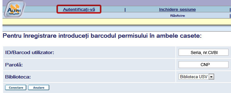 1. În webOPAC se face autentificarea utilizatorului: