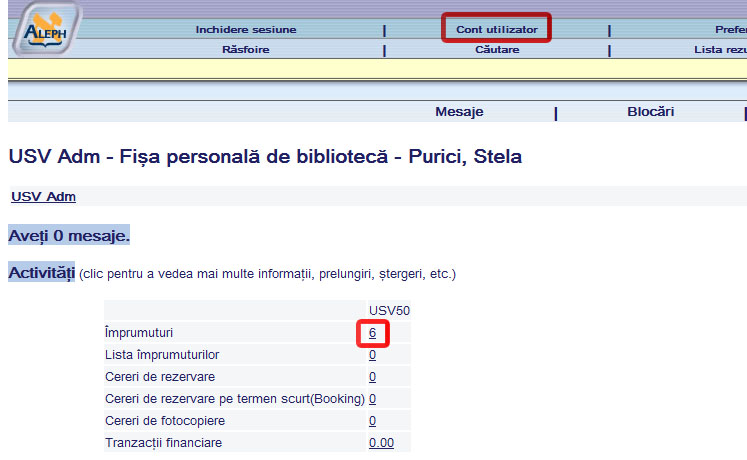 2. Pentru vizualizarea Fişei personale de bibliotecă, din meniul principal, se va apela opţiunea Cont utilizator. Pentru vizualizarea situaţiei împrumuturilor, clic pe numărul aferent Împrumuturi:
