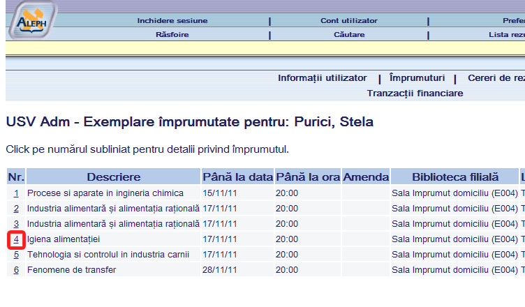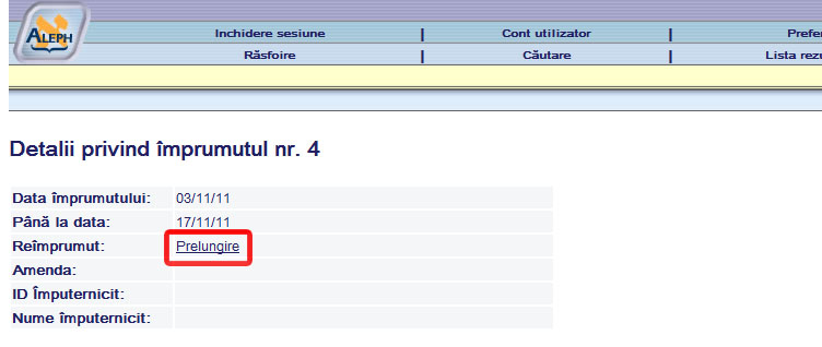 - să nu existe cerere (rezervare) pentru publicaţia respectivă.Pentru un titlu se poate efectua o singură prelungire a termenului de împrumut (14 zile).